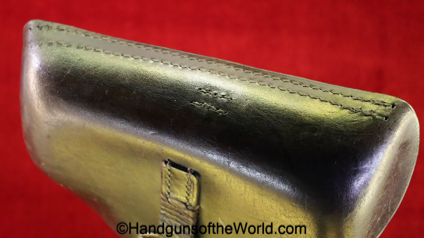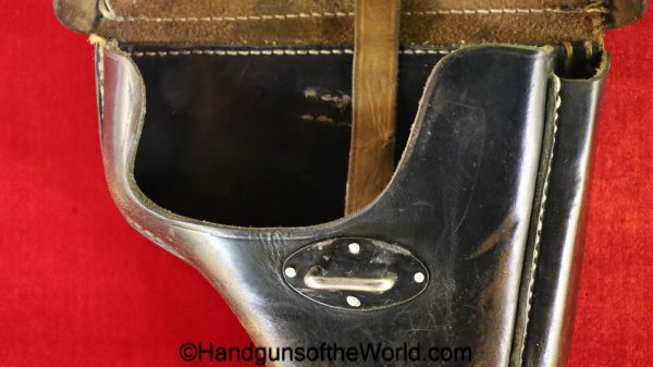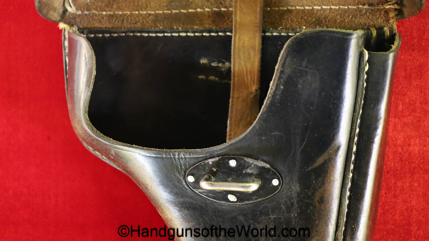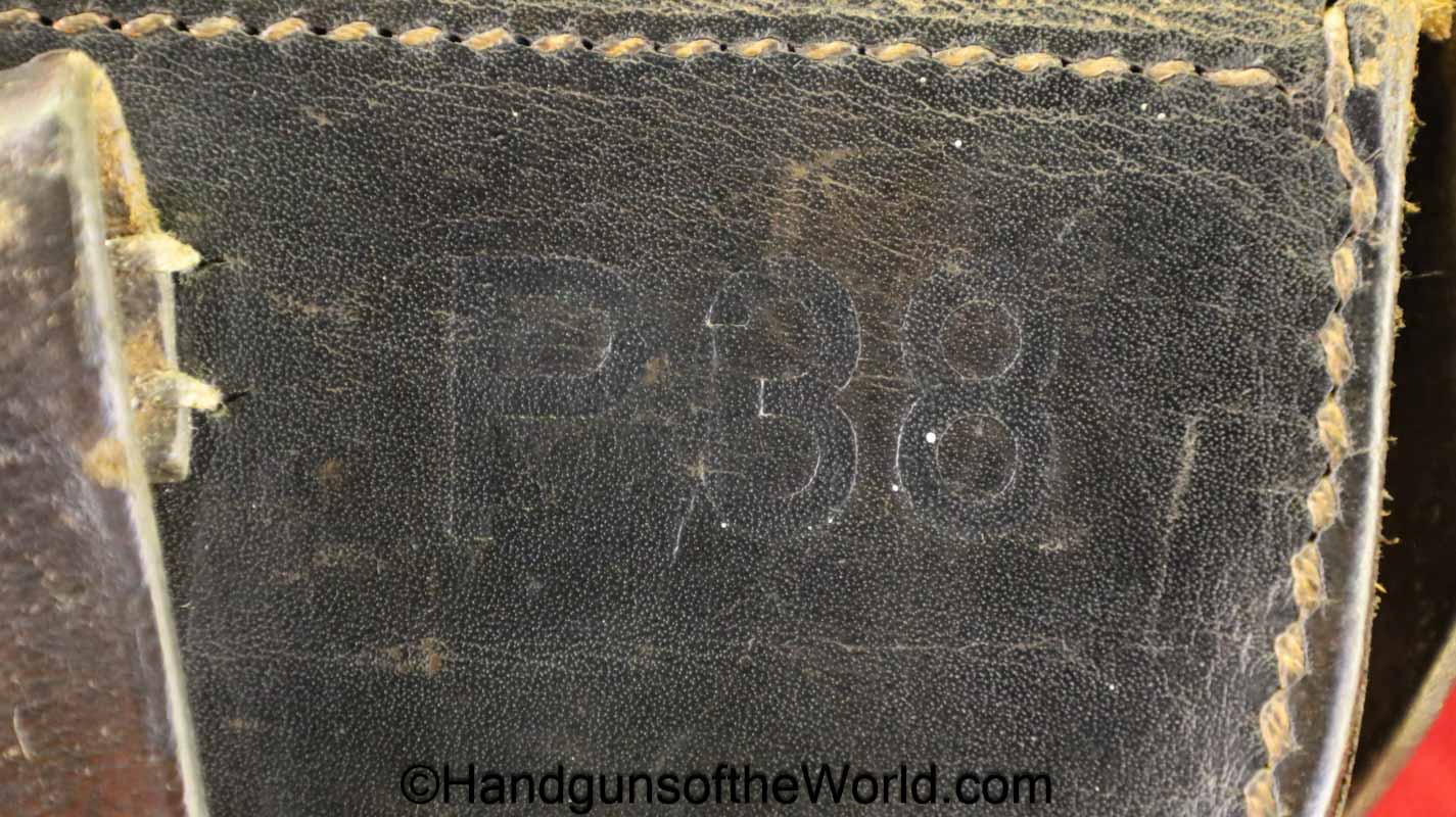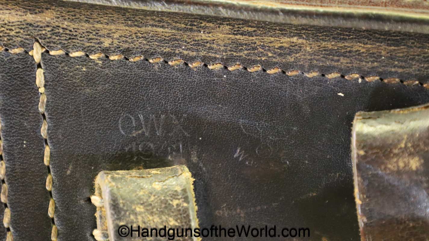 Original Walther P-38 Pistol Holster. Black leather hardshell maker marked EWX-1941-WaA195-P.38 on the back. Overall VG-VG+.