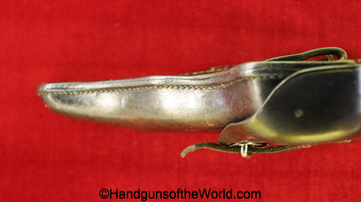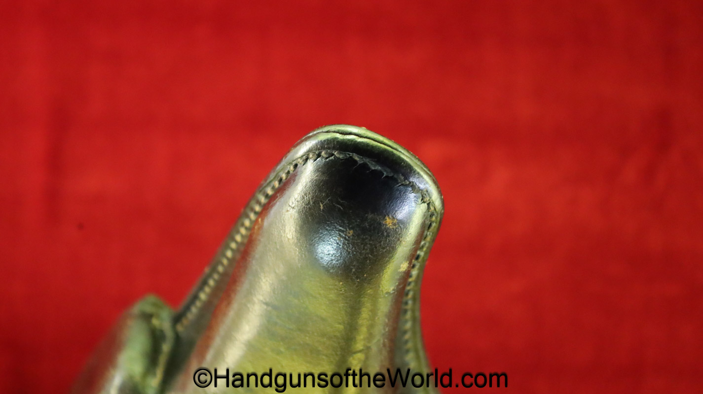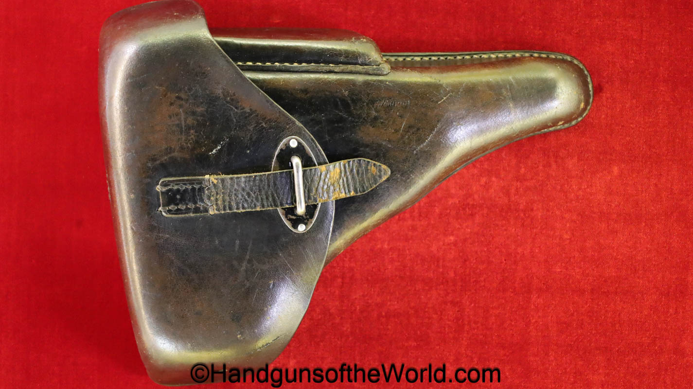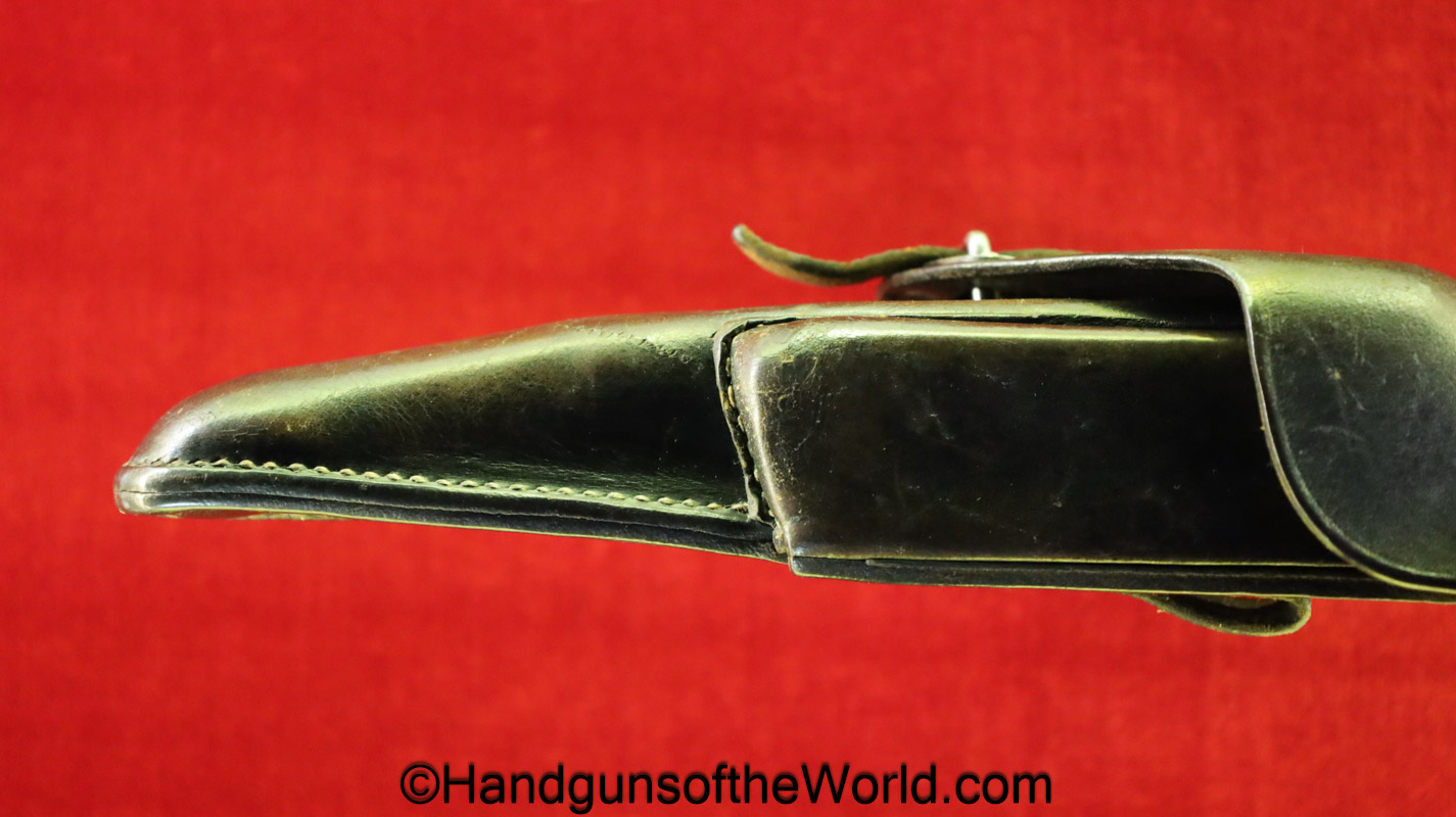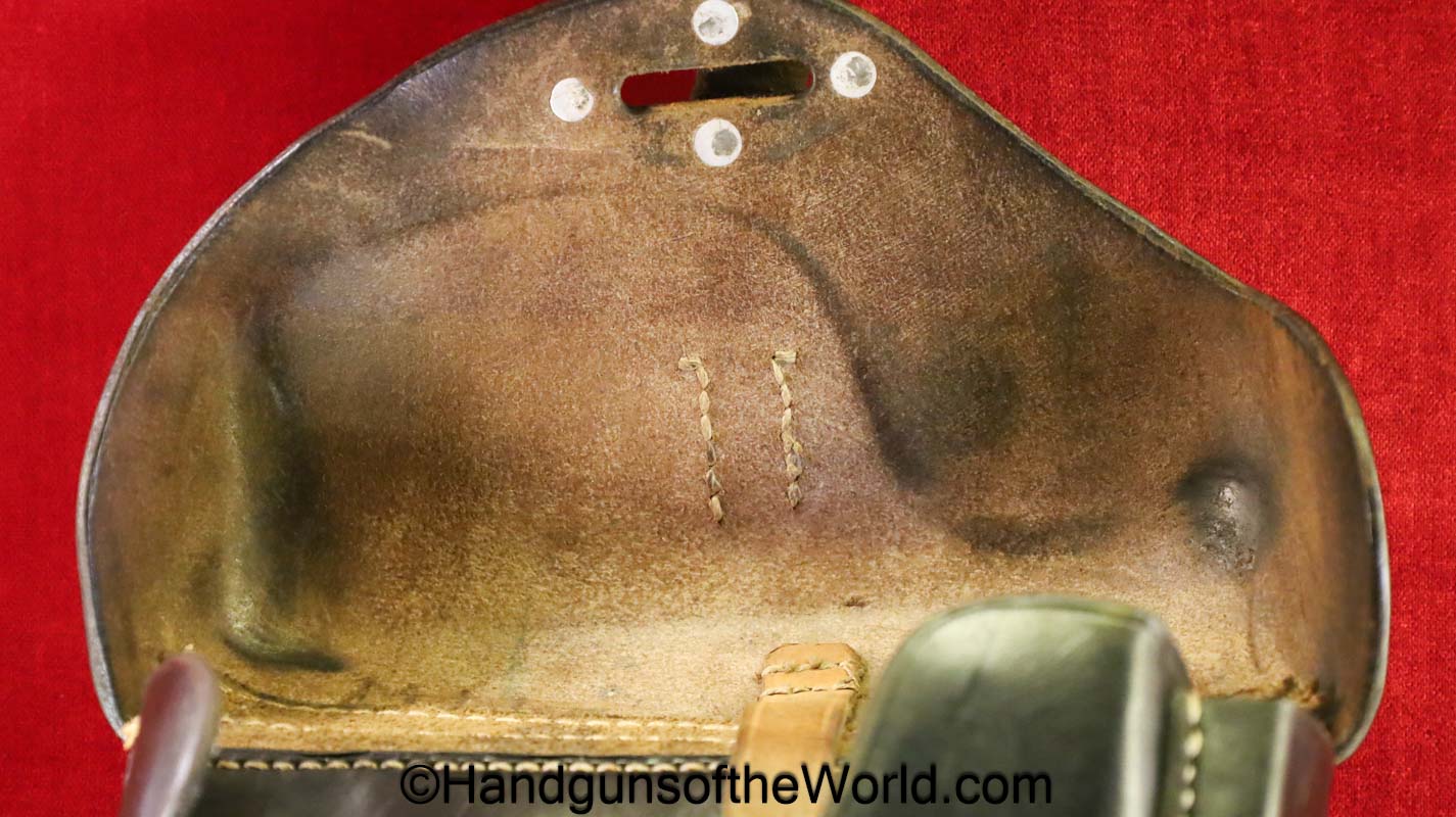Original Walther P-38 Pistol Holster. Black leather hardshell maker marked EWX-1941-WaA195-P.38 on the back. Overall VG-VG+.