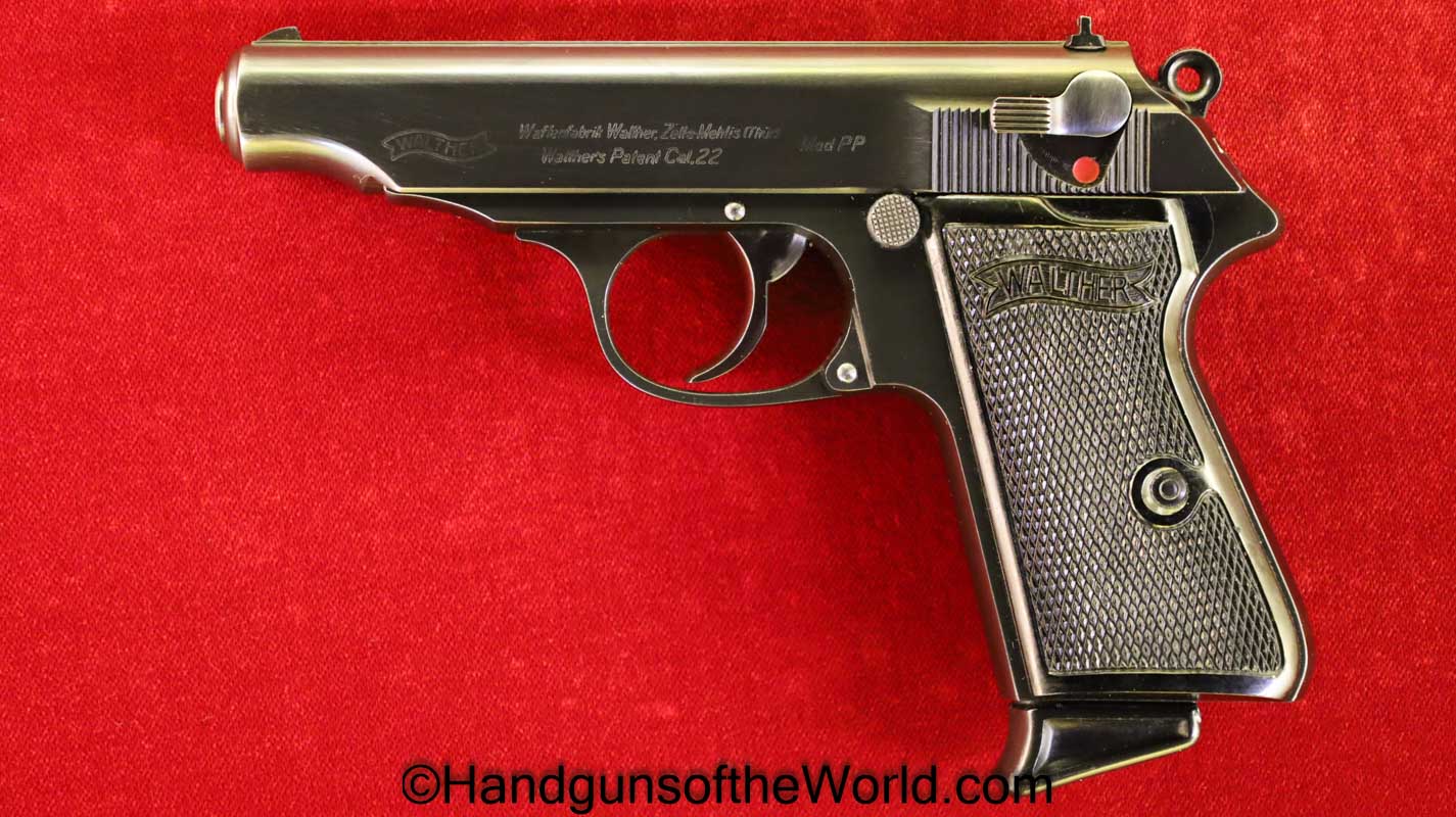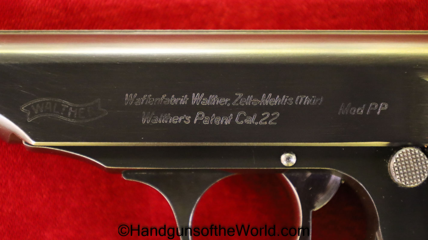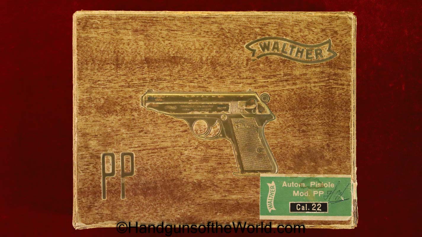 Walther PP, .22lr. This WWII era pistol has the Nazi eagle N proofs on the frame, slide and barrel. This has the correct black Bakelite grips and black finger extension magazine base. Built in 1940, this retains 99+% of a nice restored blue and an excellent bore. The original woodgrain pattern, numbered cardboard box with the Walther Factory picture tin an extra magazine and the manual are included.