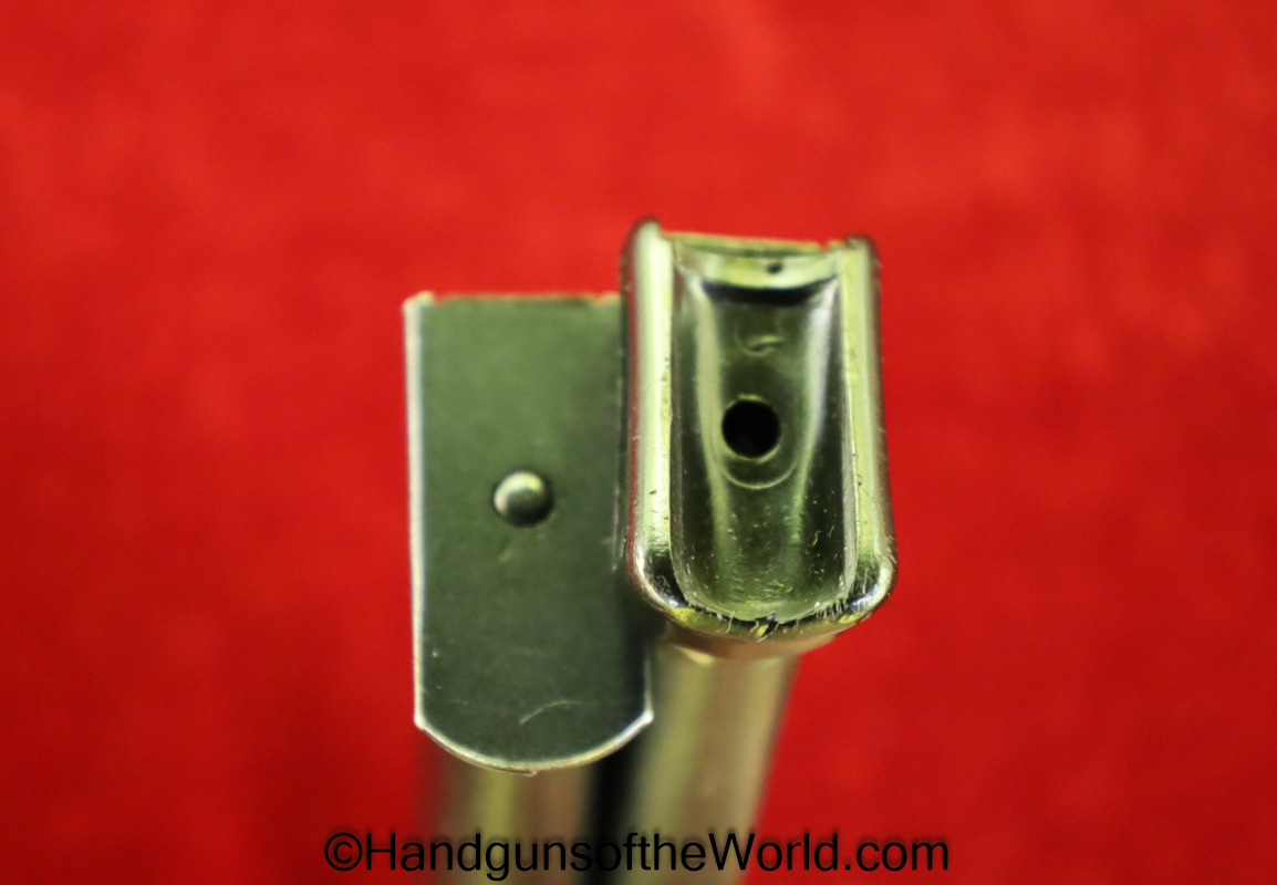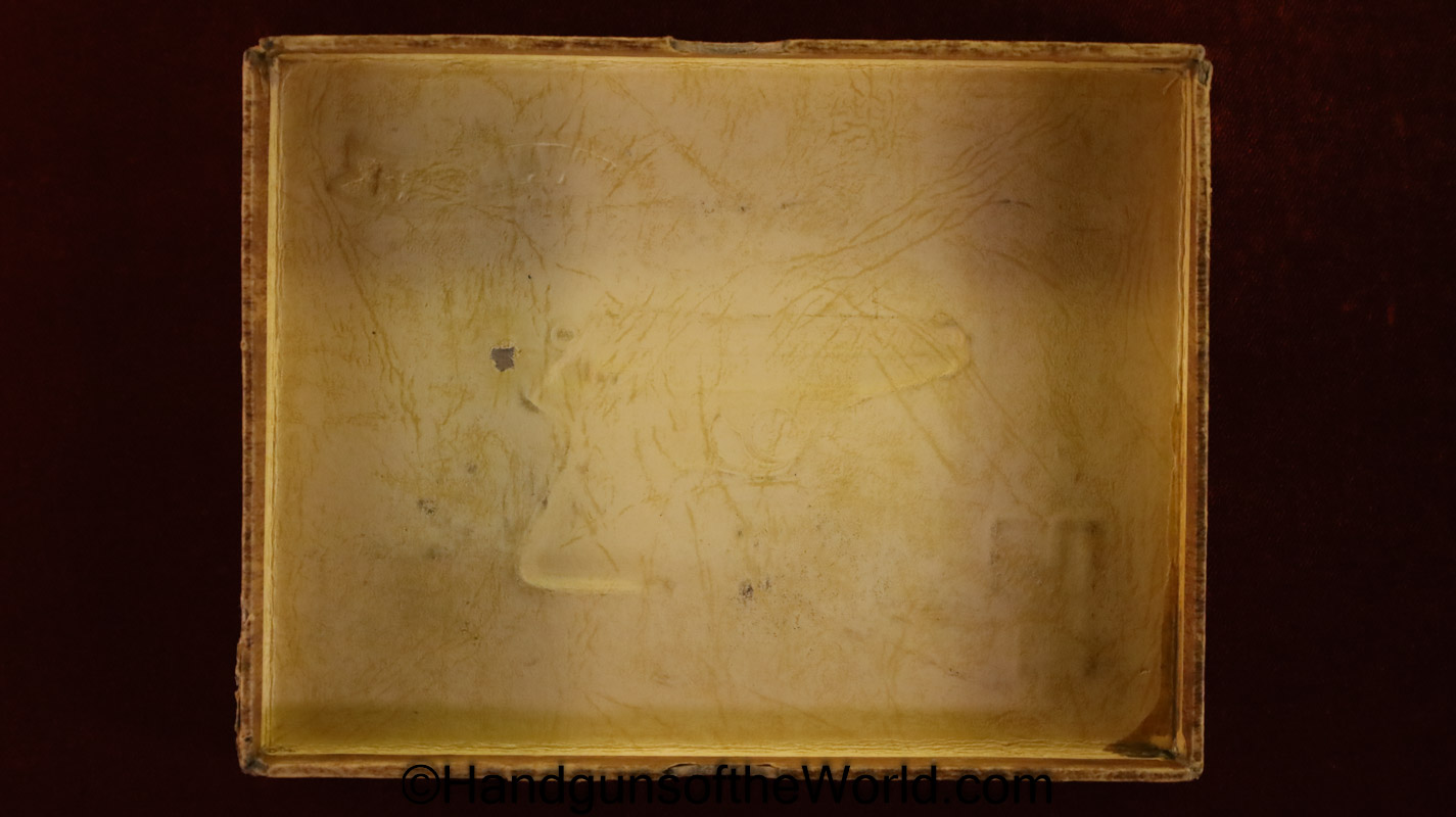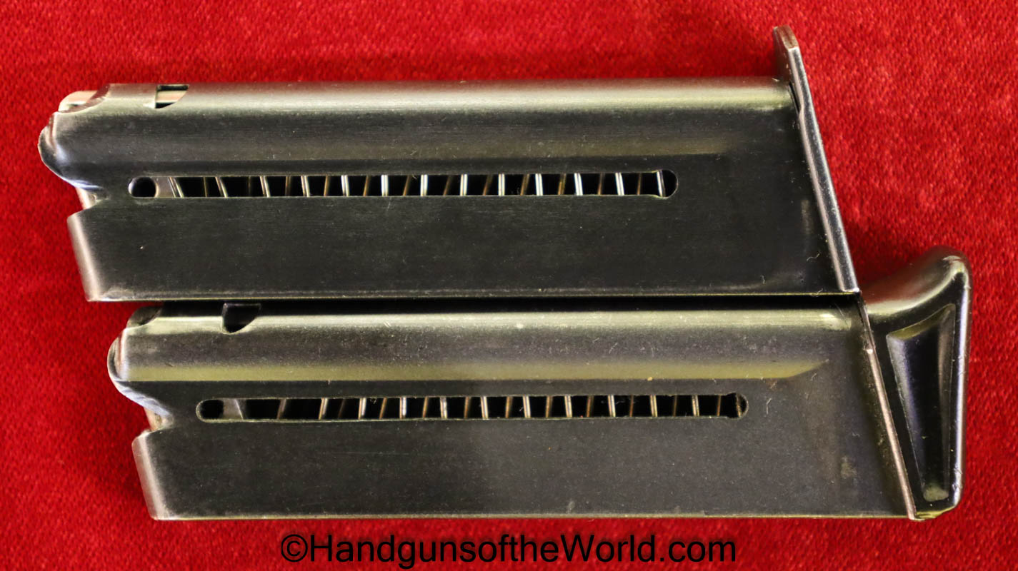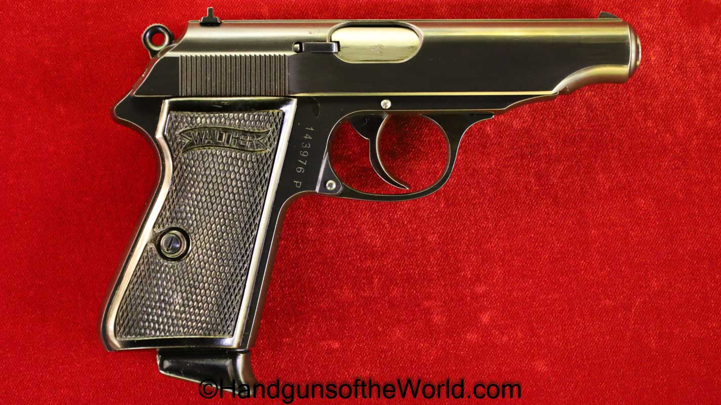 Walther PP, .22lr. This WWII era pistol has the Nazi eagle N proofs on the frame, slide and barrel. This has the correct black Bakelite grips and black finger extension magazine base. Built in 1940, this retains 99+% of a nice restored blue and an excellent bore. The original woodgrain pattern, numbered cardboard box with the Walther Factory picture tin an extra magazine and the manual are included.