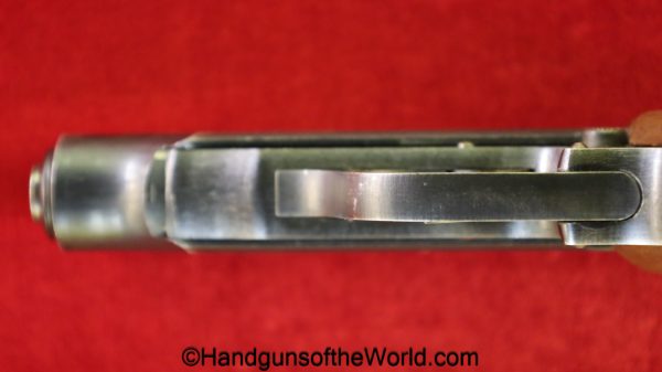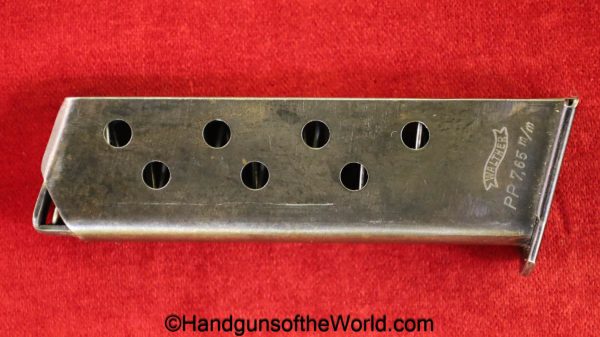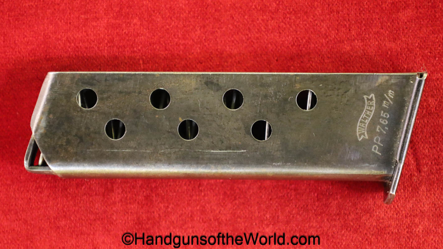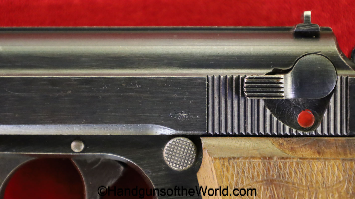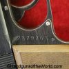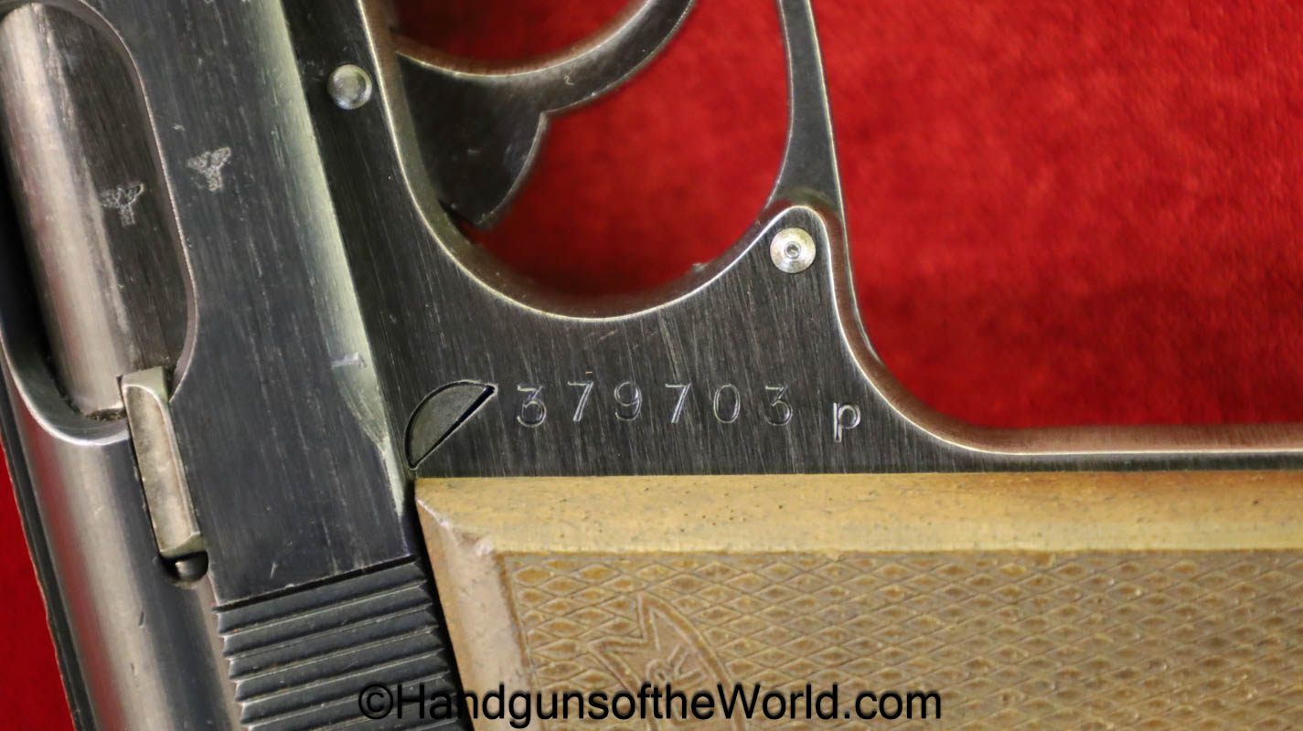 Walther PP, 7.65mm. This is a Very Late-War WaA359 Proofed pistol with a matching frame and slide. This has the AC code slide marking under the serial number on the right, and pressed Beechwood Walther banner grips. This comes with a blue W marked magazine. The blue rates about 92% and the bore is excellent.