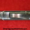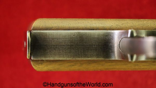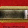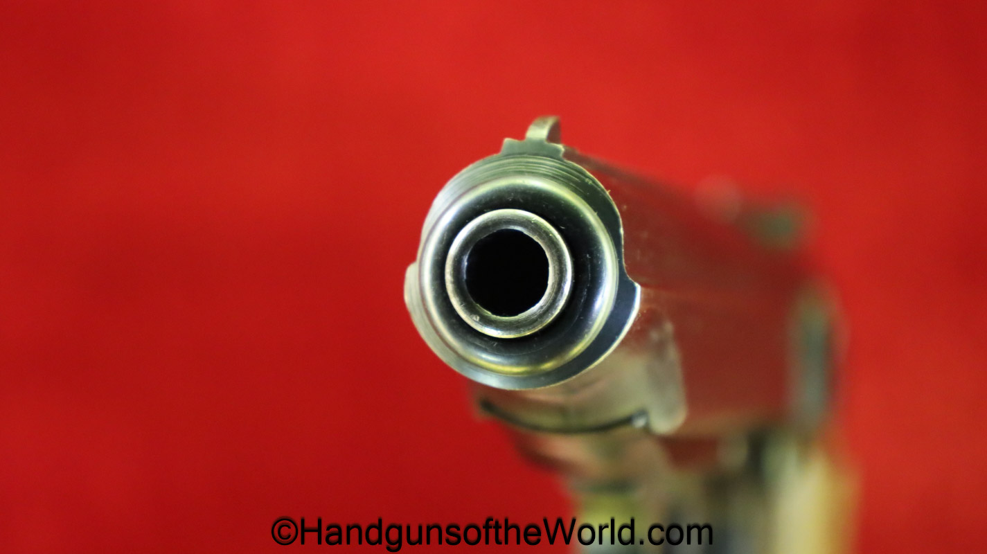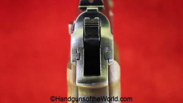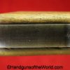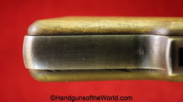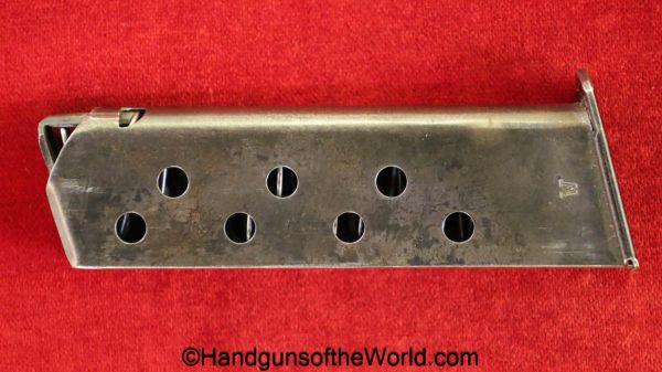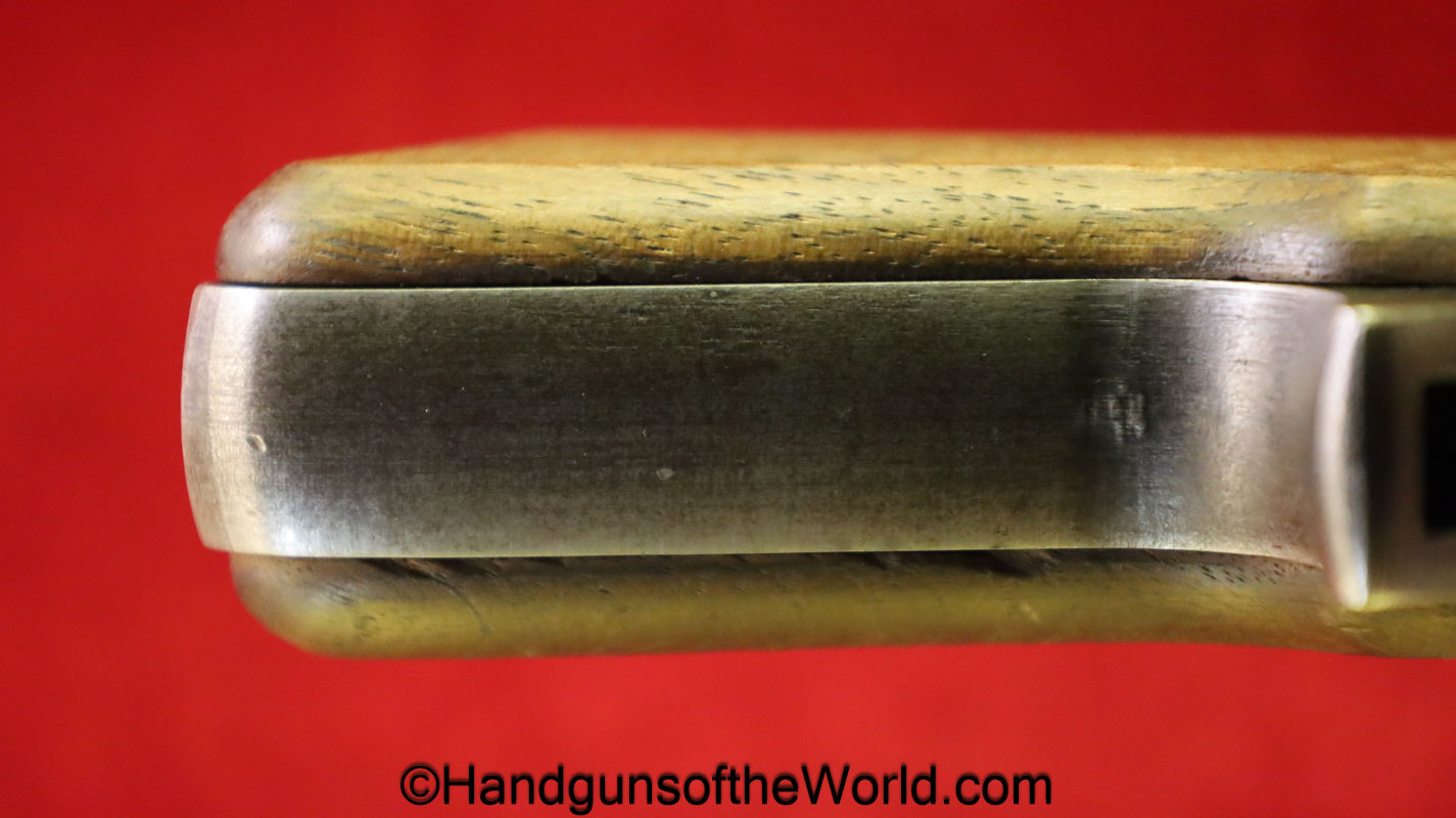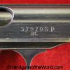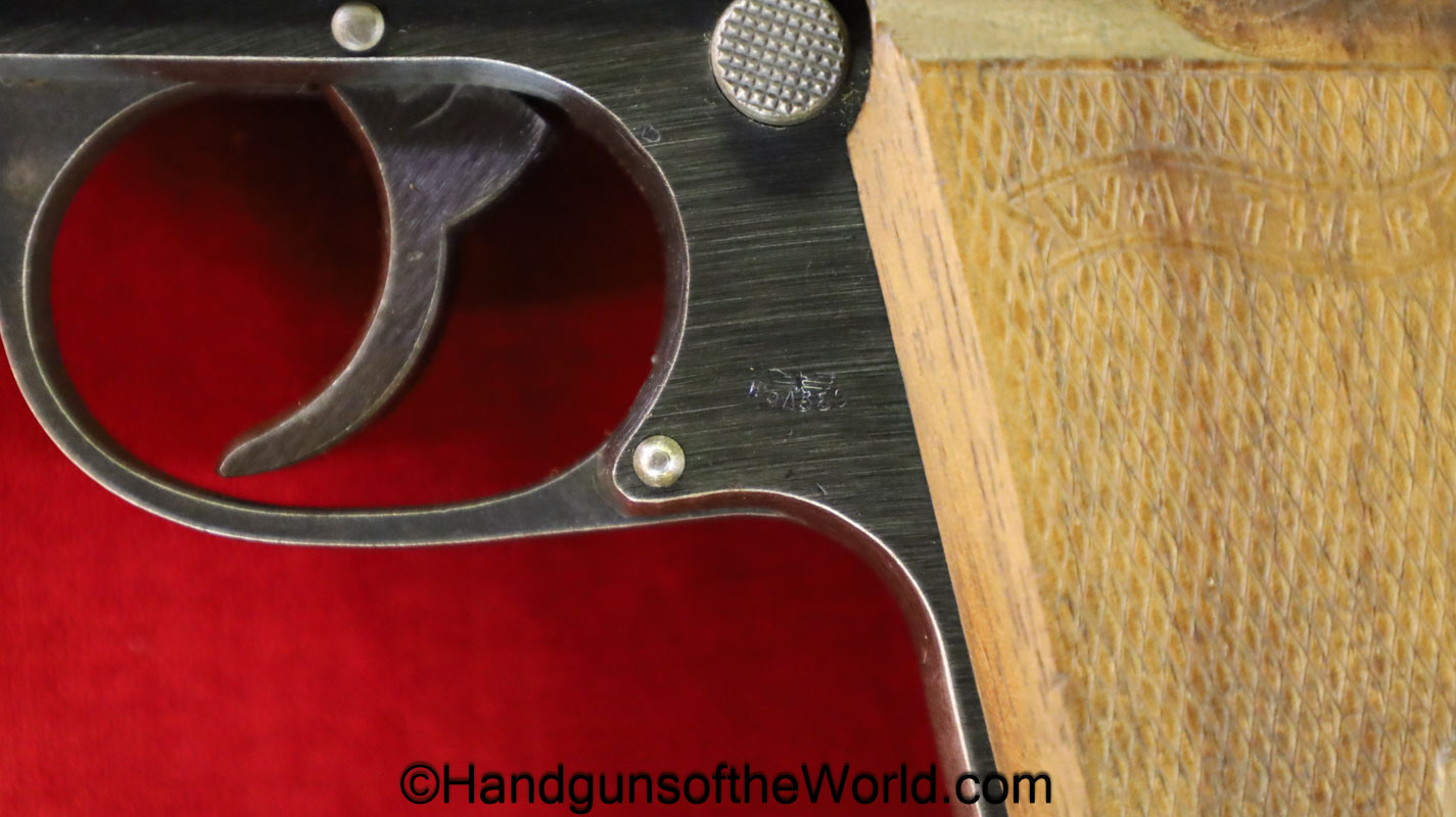 Walther PP, 7.65mm. This is a Very Late-War WaA359 Proofed pistol with a matching frame and slide. This has the AC code slide marking under the serial number on the right, and pressed Beechwood Walther banner grips. This comes with a blue W marked magazine. The blue rates about 92% and the bore is excellent.