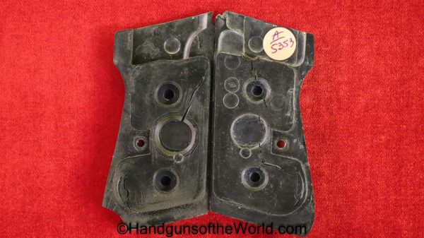 Original WWII era Walther PP Pistol grips. Black Bakelite with Walther banner at the top. These have the metal weights inset into the material, and have been post war French notched for a lanyard loop. Overall Excellent.