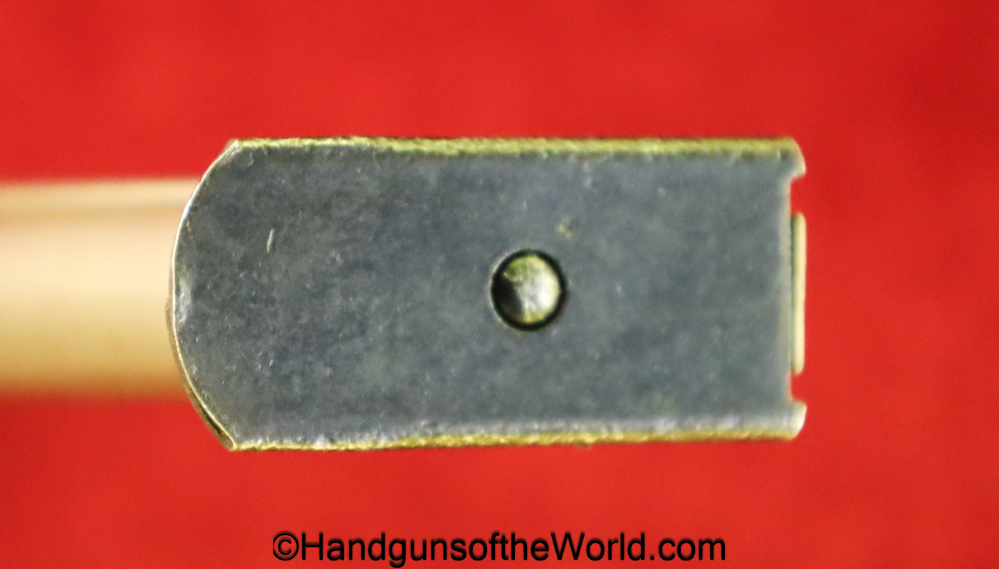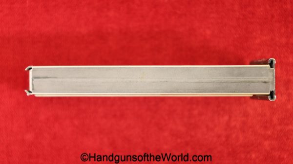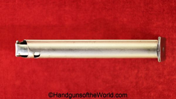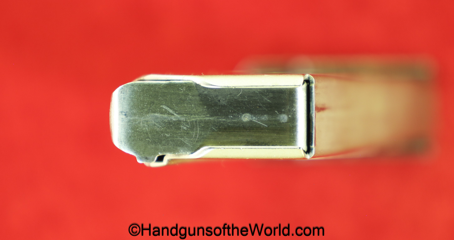 Original Walther PPk .380 caliber Pistol Magazine. Marked on 1 side “Cal 380acp” and on the other side “Cal 9mm Kurz” with the Walther banner on both sides. This has 98% nickel finish on the body, and a blue base.
