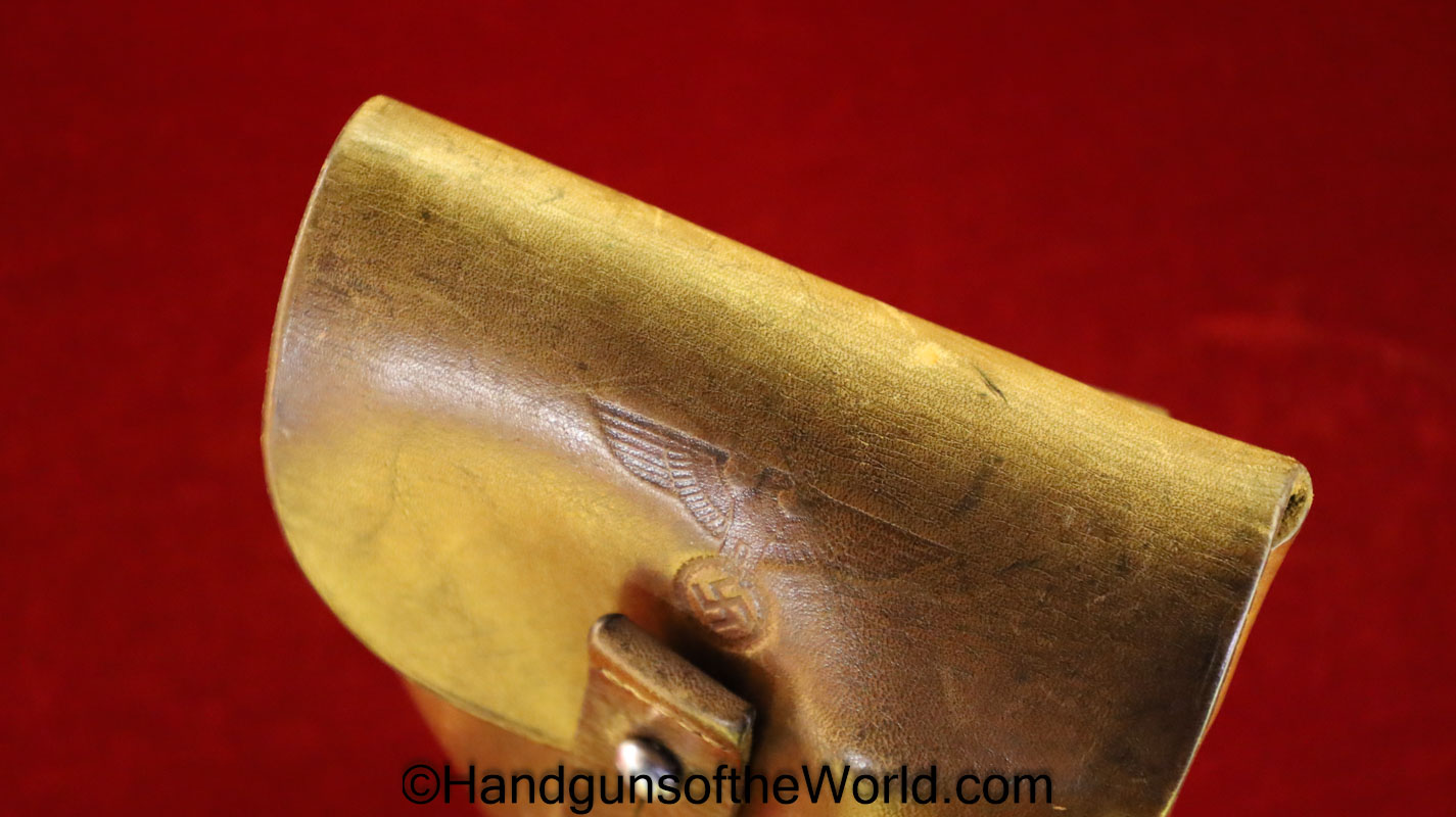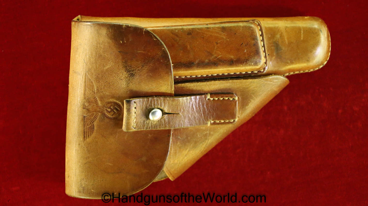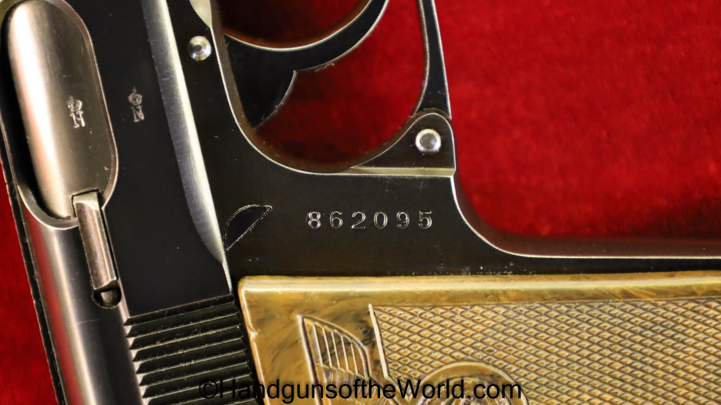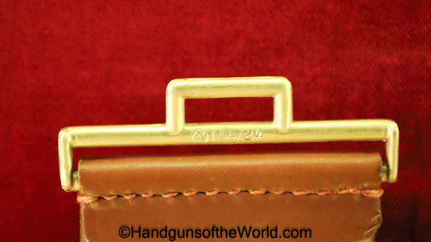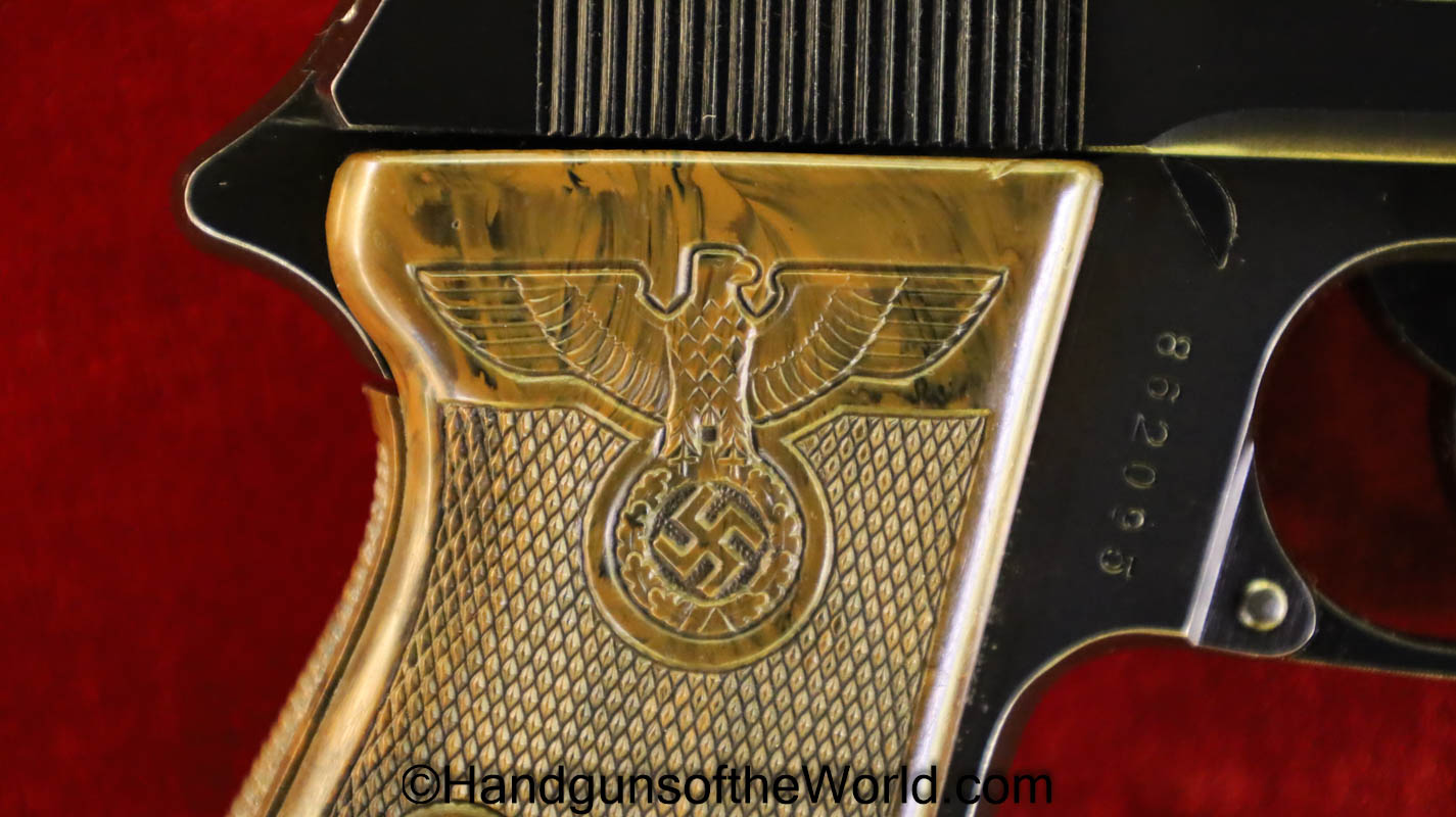 Walther PPk, 7.65mm. This is German Crown N proofed and built about 1936. This has excellent, original brown Bakelite Party Leader grips with a large Nazi eagle at the top of each side and a brown finger extension magazine base. The blue rates 99% and the bore is excellent. A tan leather Party leader holster with the same Nazi Eagle on the lid, marked Akah-DRGM under the tab and an extra flat base magazine completes this as issued full rig. Also included is a brown leather belt and Party leader buckle. The gold-plated aluminum buckle is RZM marked on the back and on the belt clip. A Certificate of Originality will be included.