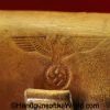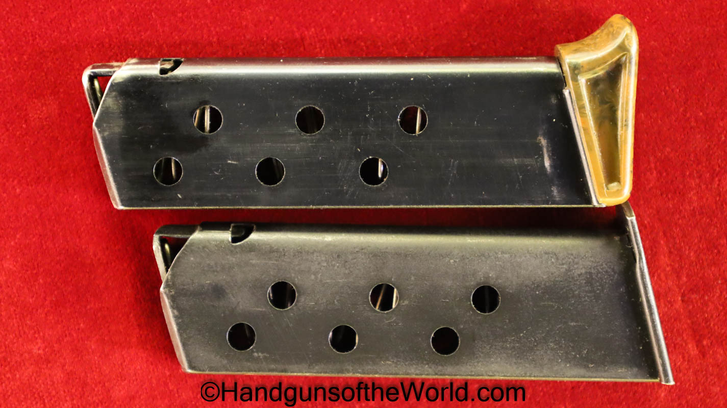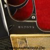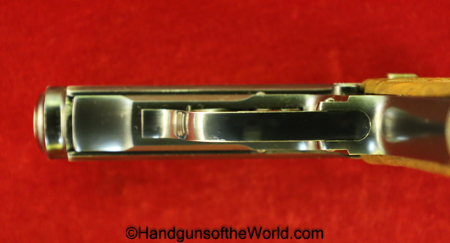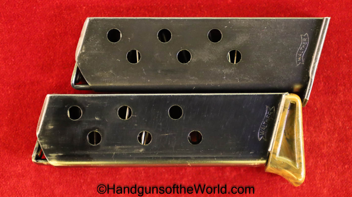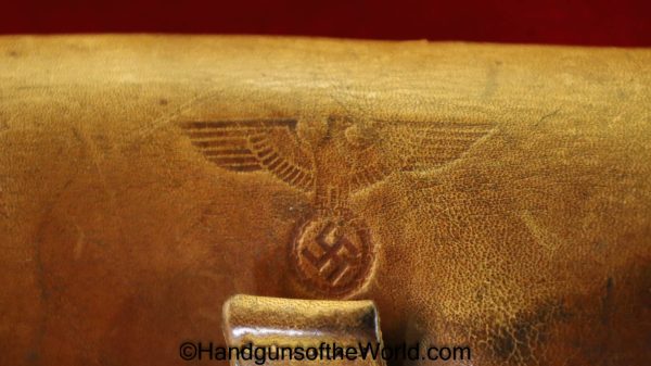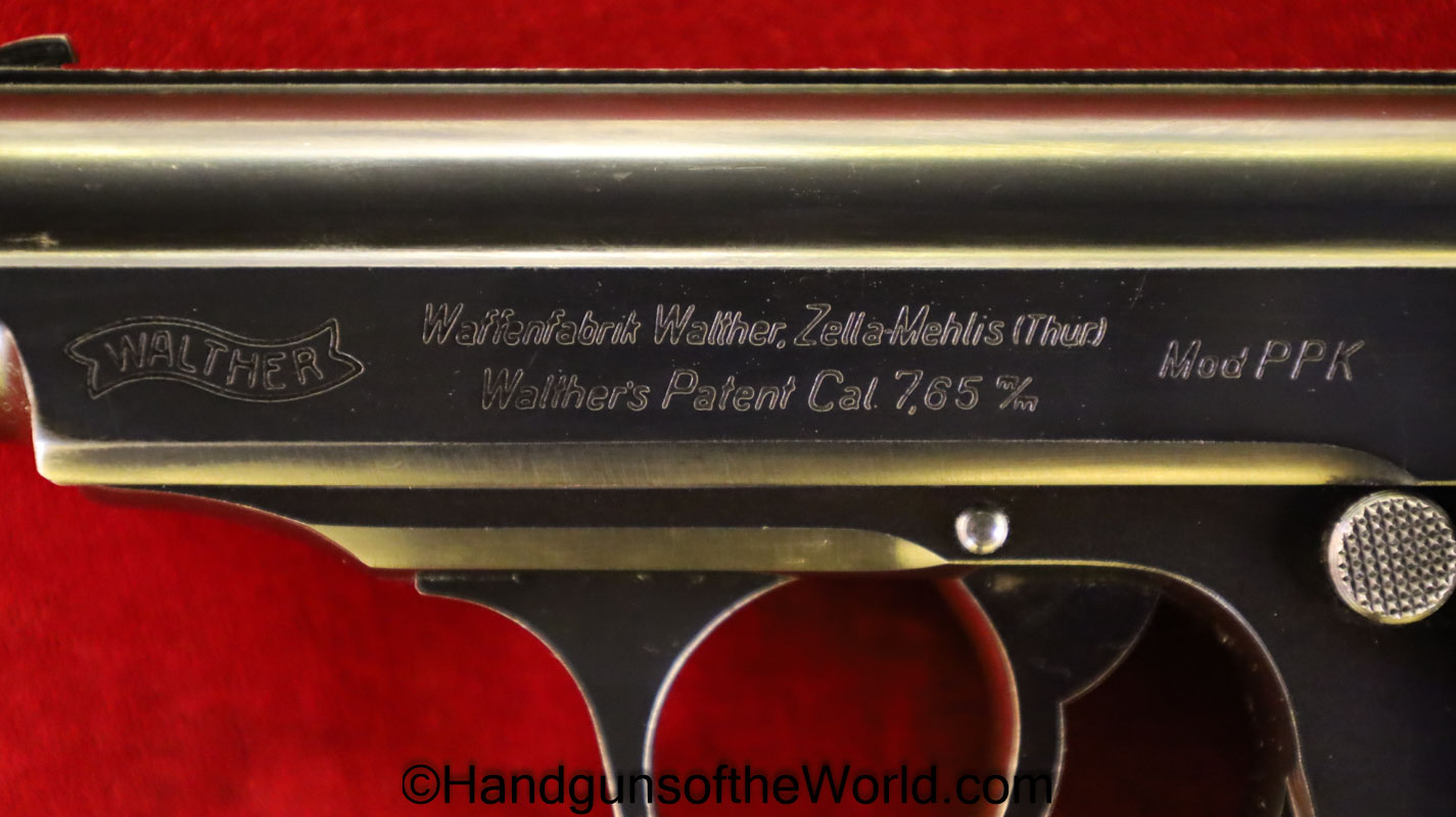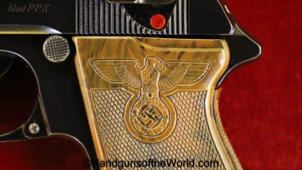 Walther PPk, 7.65mm. This is German Crown N proofed and built about 1936. This has excellent, original brown Bakelite Party Leader grips with a large Nazi eagle at the top of each side and a brown finger extension magazine base. The blue rates 99% and the bore is excellent. A tan leather Party leader holster with the same Nazi Eagle on the lid, marked Akah-DRGM under the tab and an extra flat base magazine completes this as issued full rig. Also included is a brown leather belt and Party leader buckle. The gold-plated aluminum buckle is RZM marked on the back and on the belt clip. A Certificate of Originality will be included.