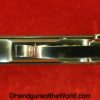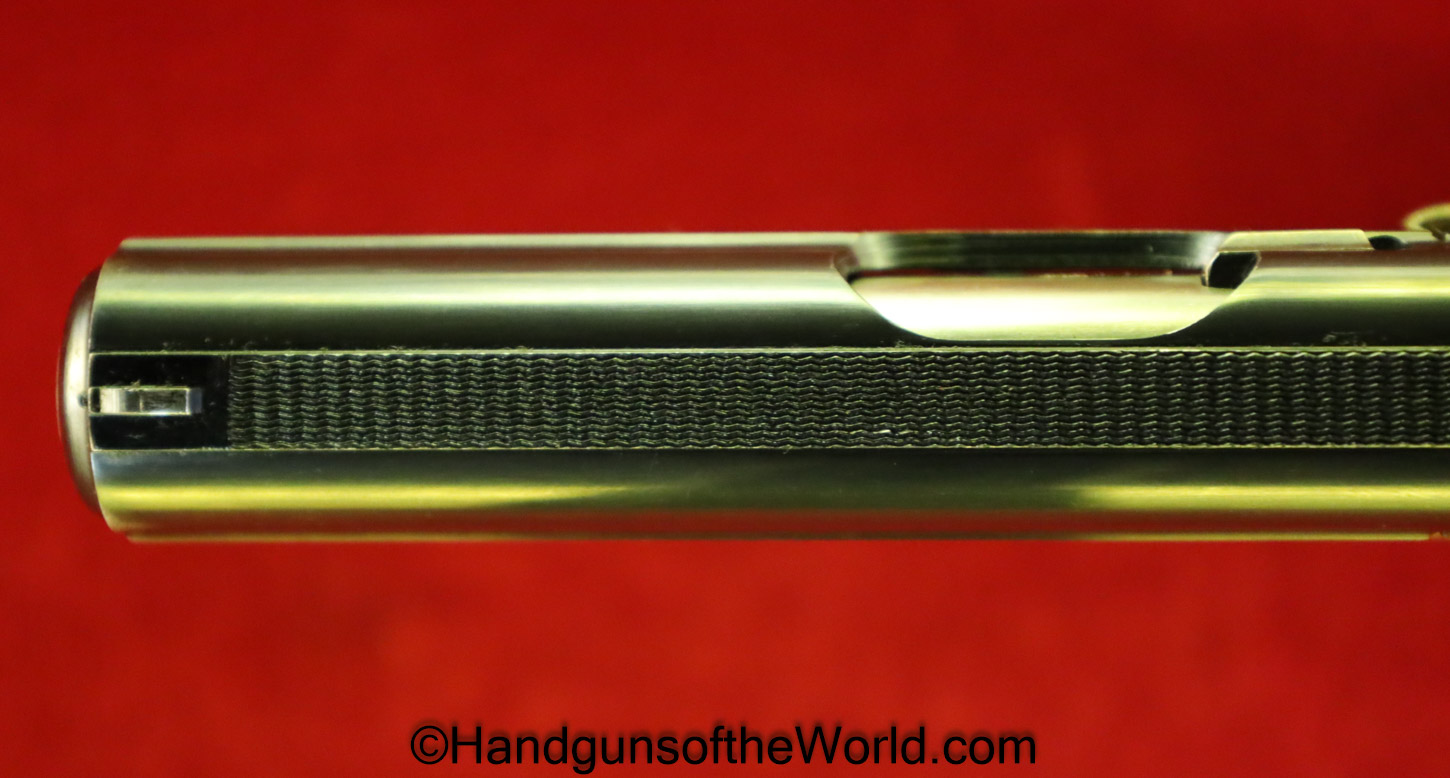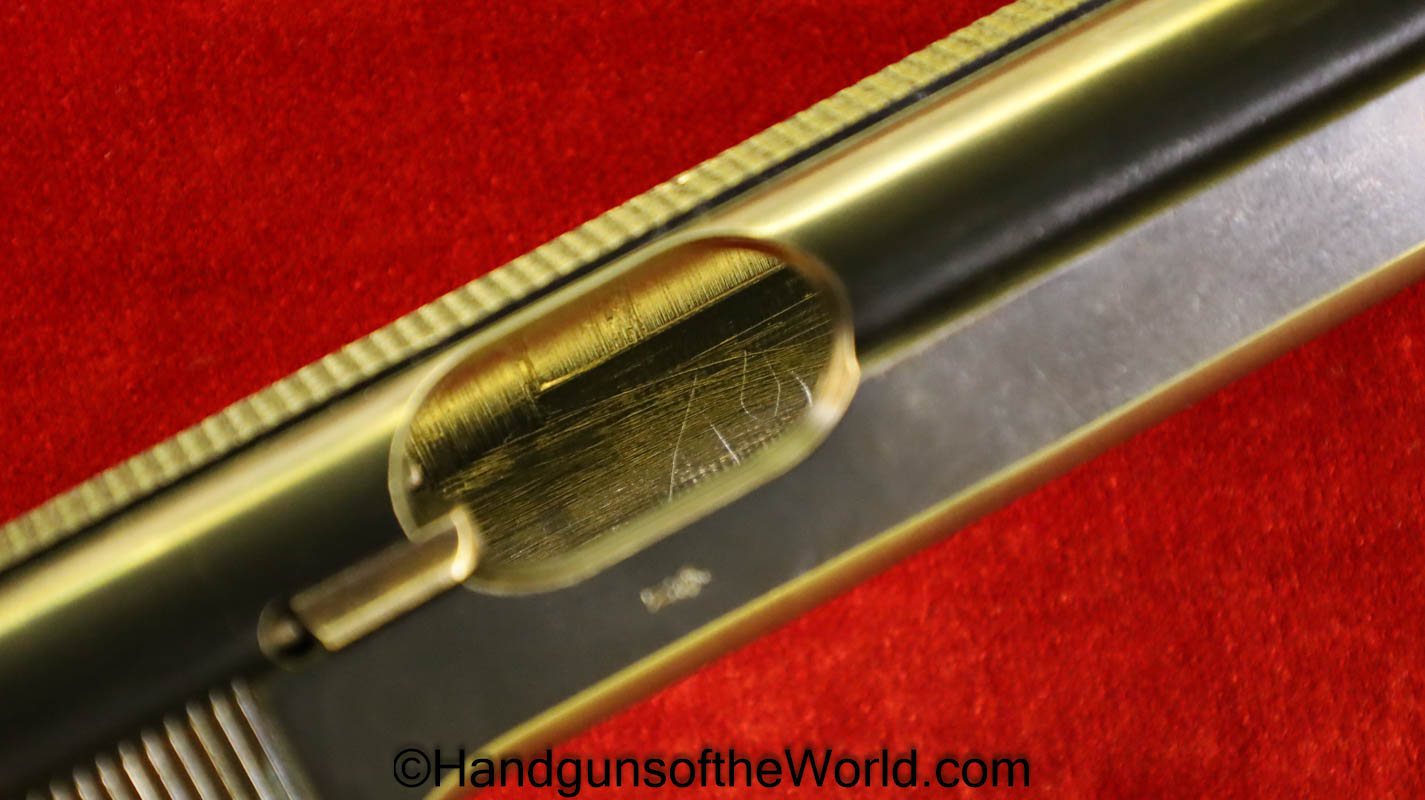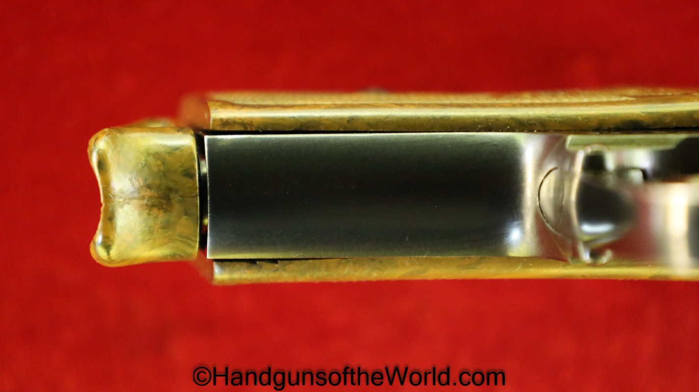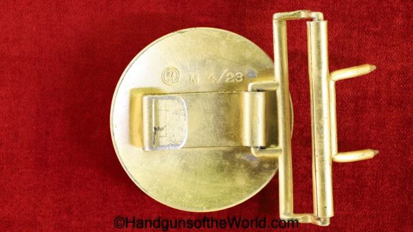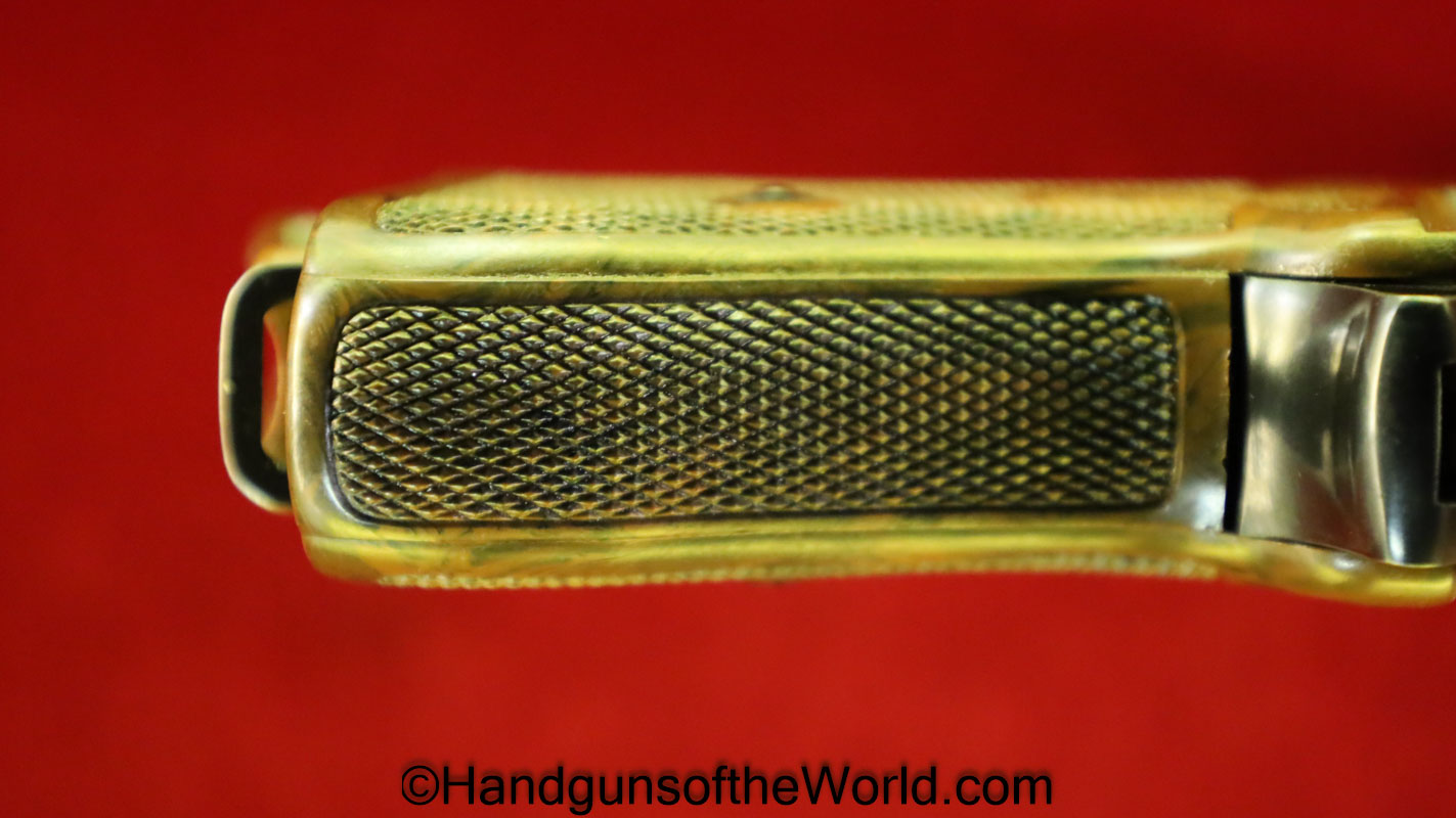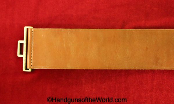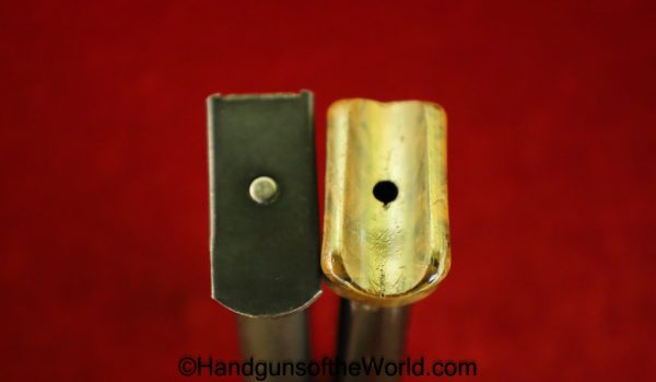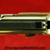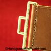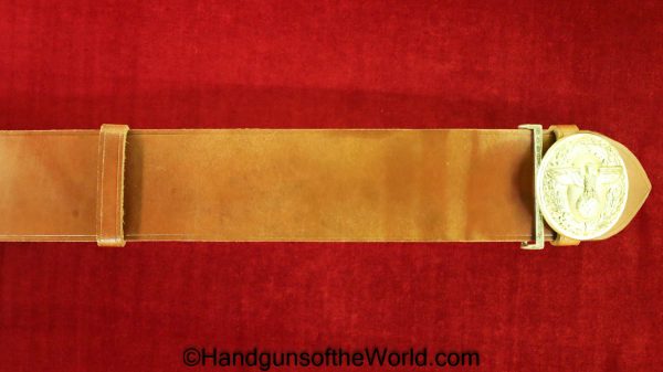 Walther PPk, 7.65mm. This is German Crown N proofed and built about 1936. This has excellent, original brown Bakelite Party Leader grips with a large Nazi eagle at the top of each side and a brown finger extension magazine base. The blue rates 99% and the bore is excellent. A tan leather Party leader holster with the same Nazi Eagle on the lid, marked Akah-DRGM under the tab and an extra flat base magazine completes this as issued full rig. Also included is a brown leather belt and Party leader buckle. The gold-plated aluminum buckle is RZM marked on the back and on the belt clip. A Certificate of Originality will be included.