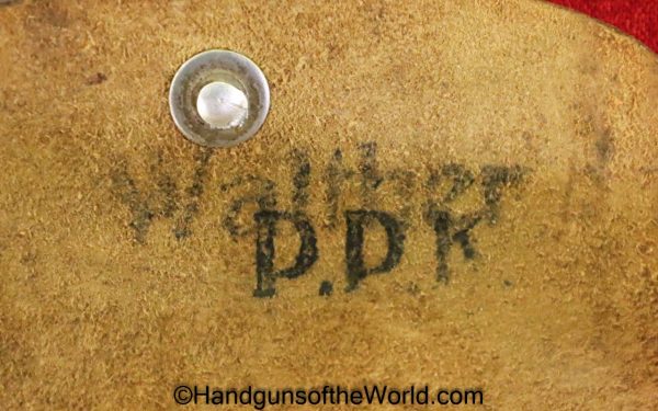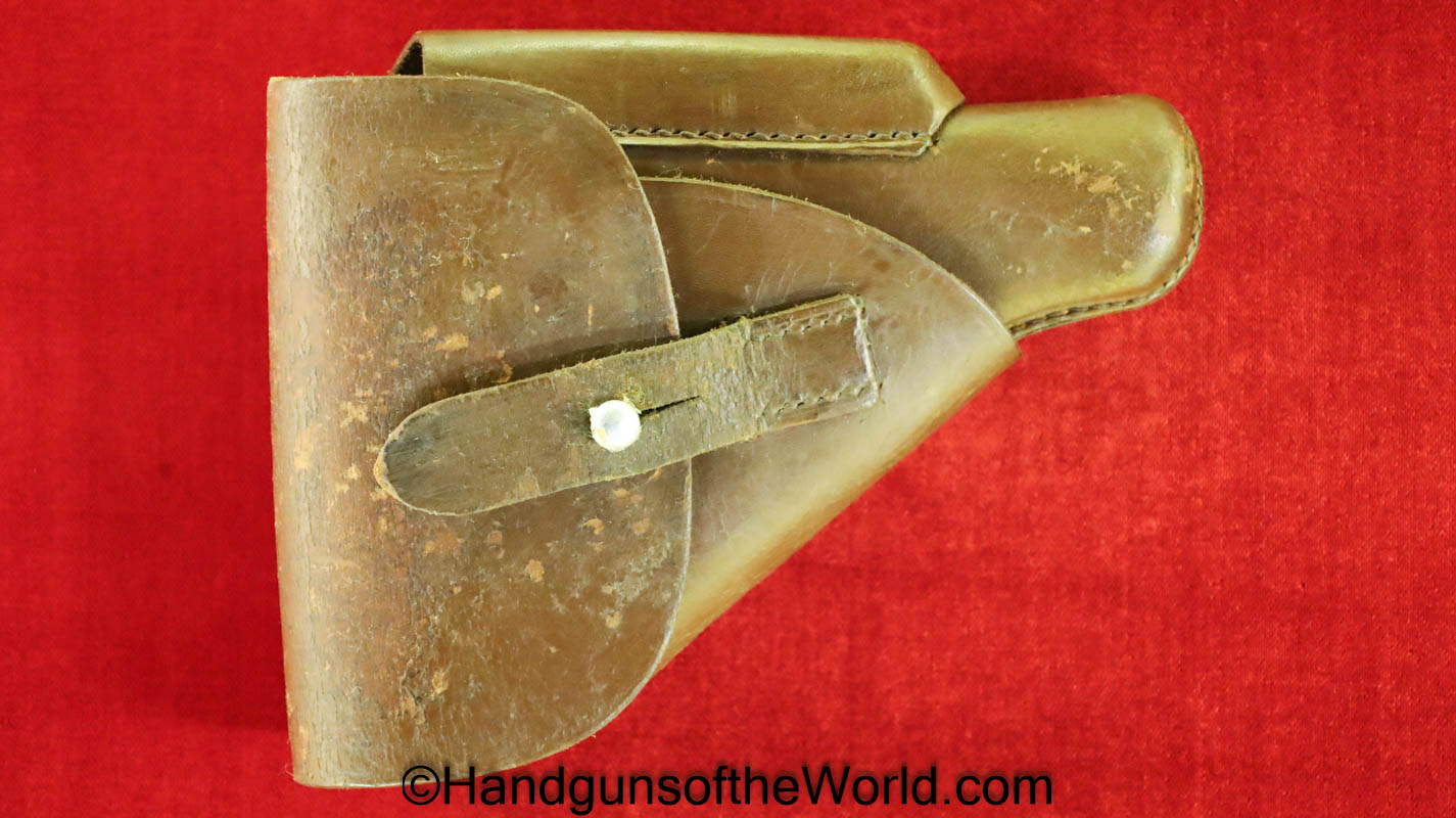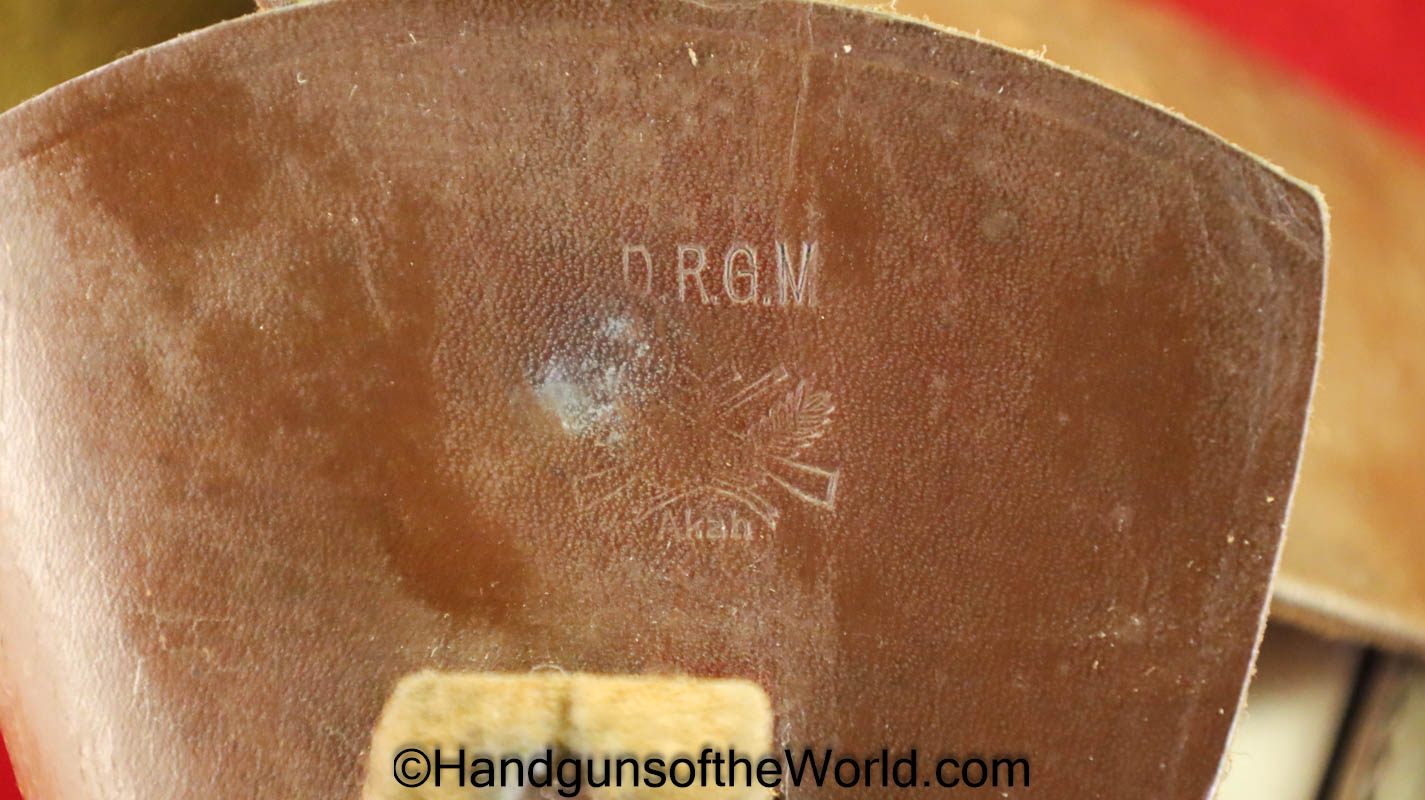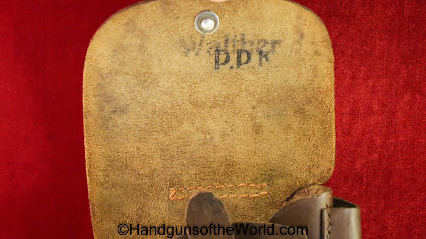 Original Walther PPk Pistol Holster. This is a brown leather breakaway with SS pattern side spare magazine pouch. This is marked Akah-DRGM under the tab. This is also ink stamped Walther PPk inside the lid. Overall VG.