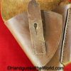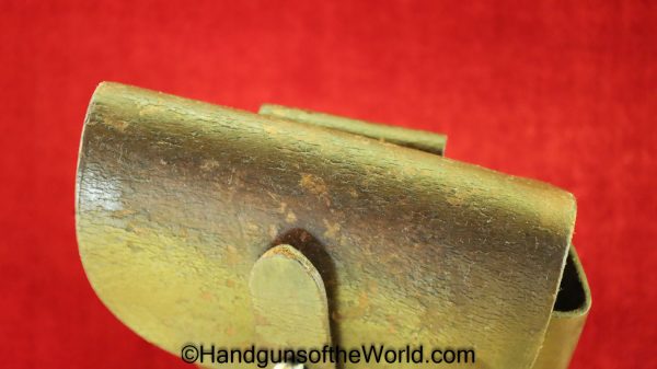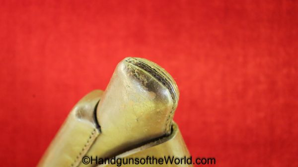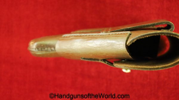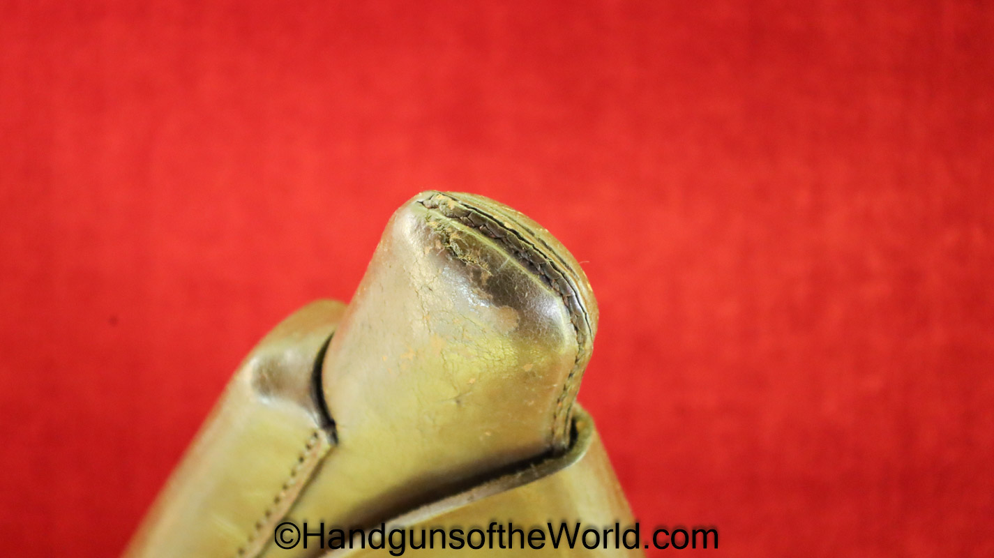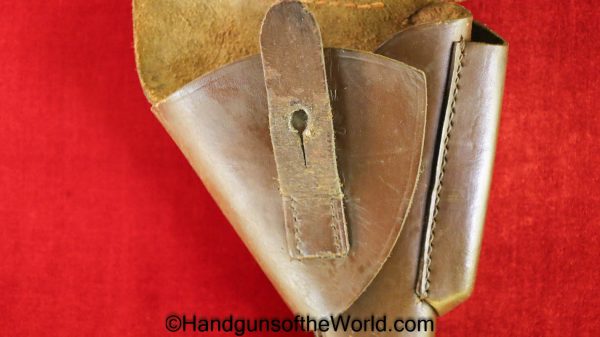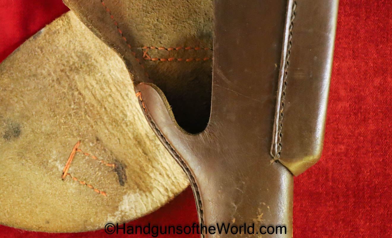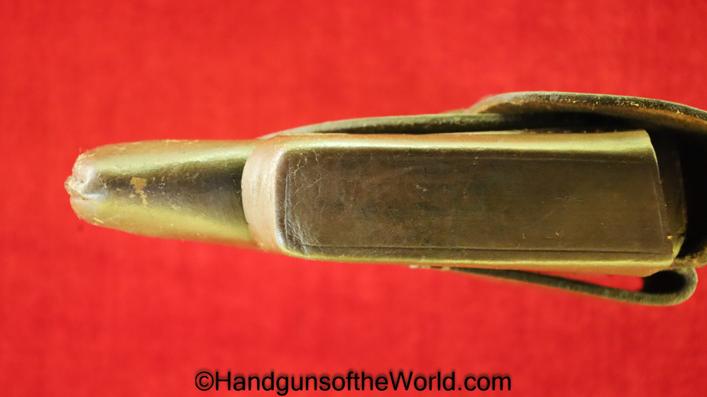 Original Walther PPk Pistol Holster. This is a brown leather breakaway with SS pattern side spare magazine pouch. This is marked Akah-DRGM under the tab. This is also ink stamped Walther PPk inside the lid. Overall VG.