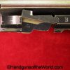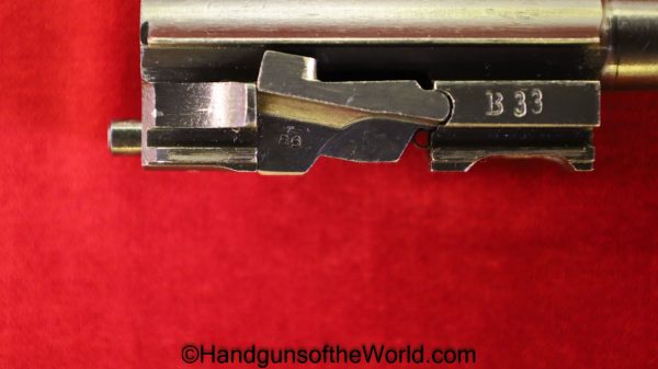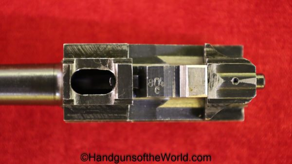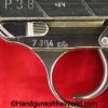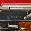 Spreewerk P-38, 9mm. This is WWII German Military Eagle 88 proofed on the major parts, and has the red/brown Bakelite grips. The slide serial number suffix is stamped upside down, along with heavy grinding/milling marks present. This has all matching numbers and no importer markings. The blue rates highly at 98% and the bore is excellent.