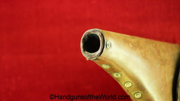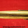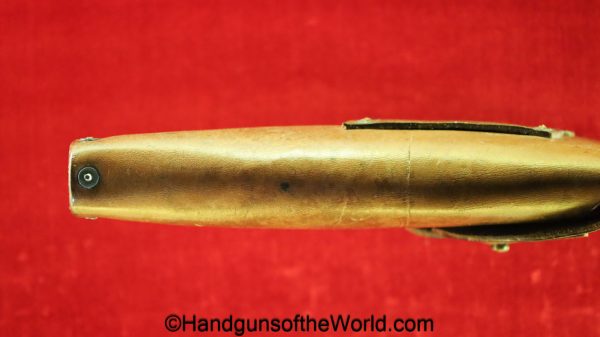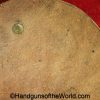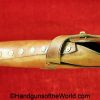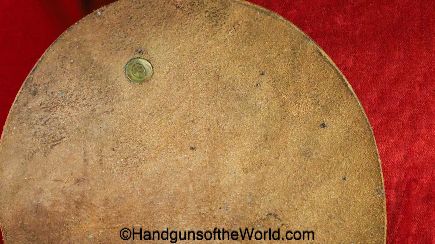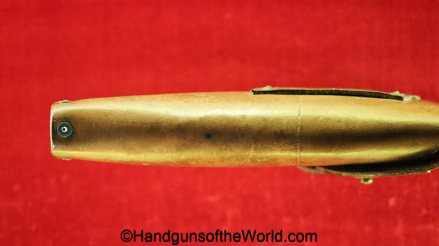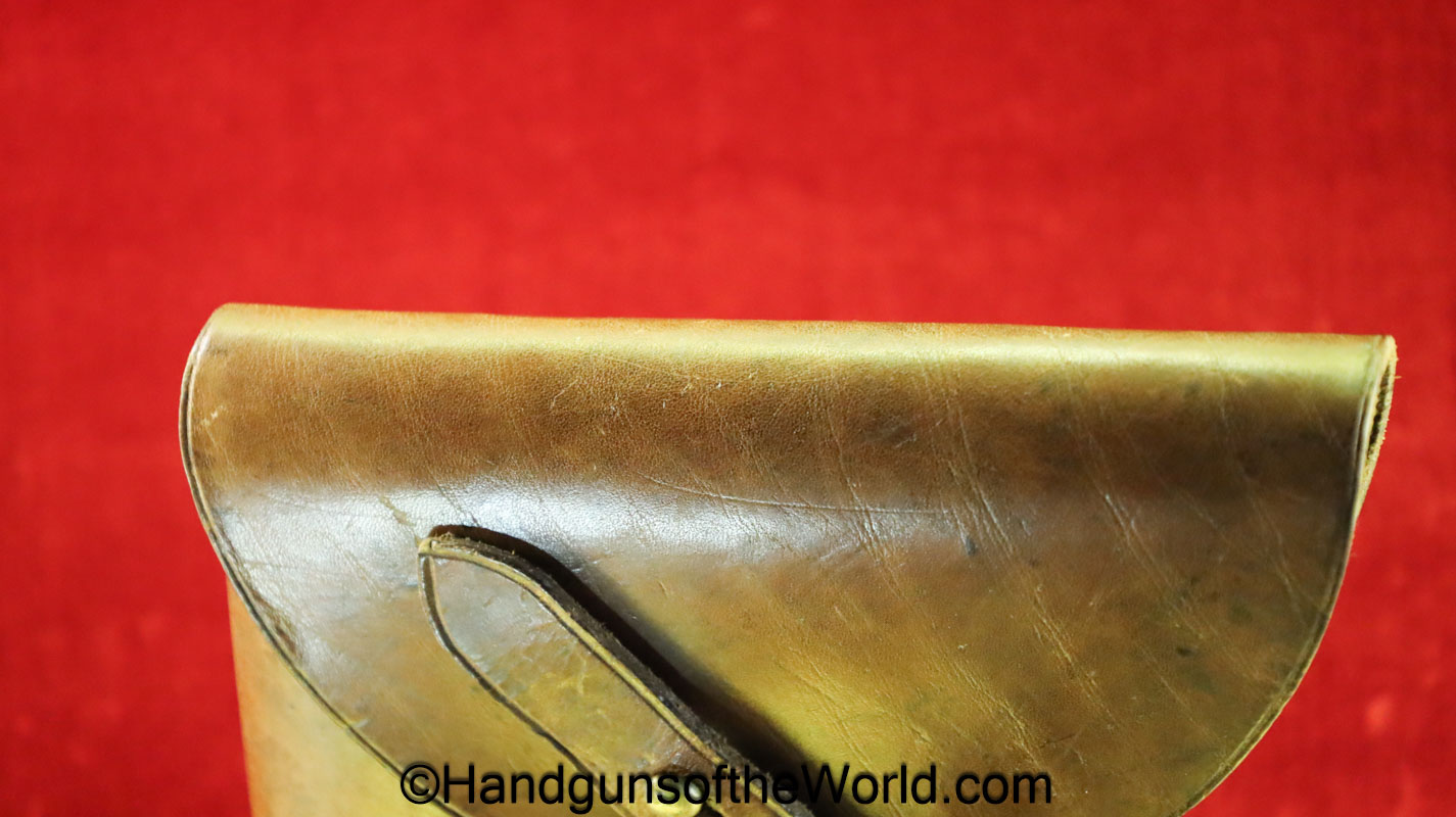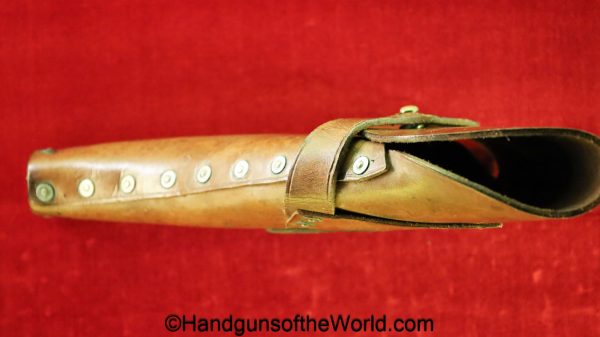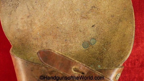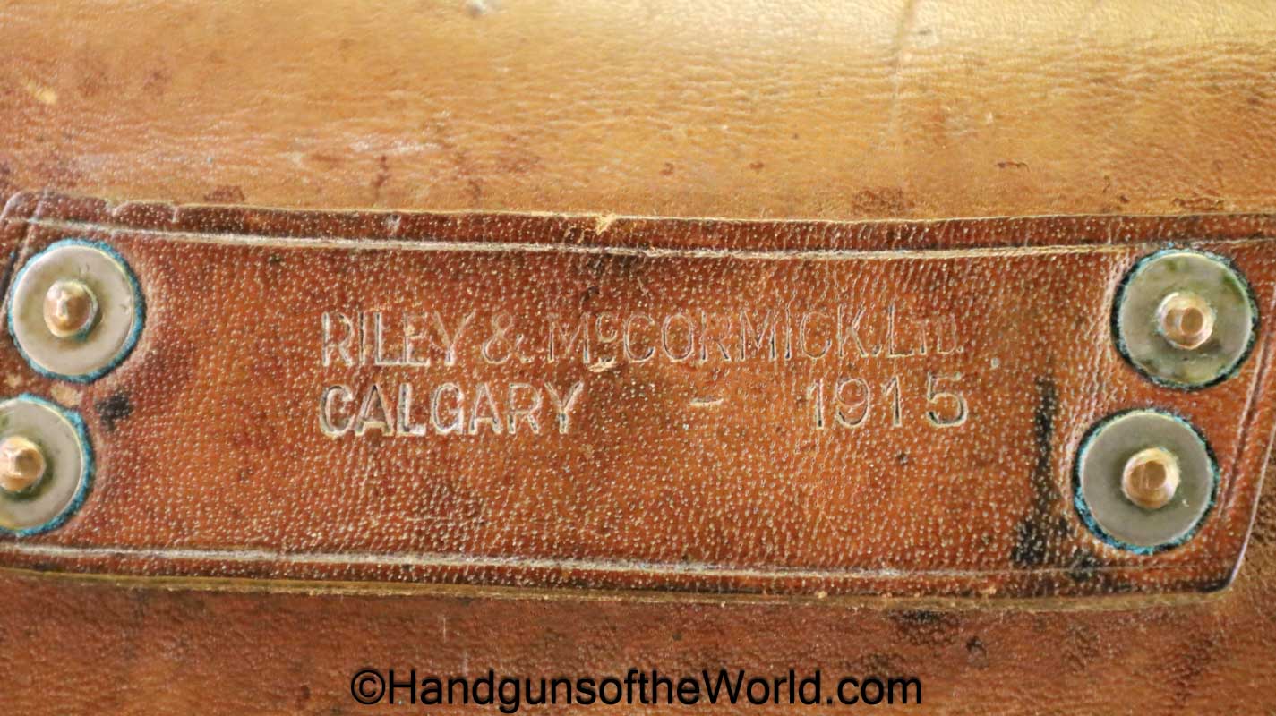Original Webley Mark I-V Revolver Holster. This is brown leather for the 4″ models, and is a Naval pattern with brass retainer rivets. Maker marked Riley & McCormick-Calgary-1915 on the back. Cut for Left hand usage. Overall VG+.