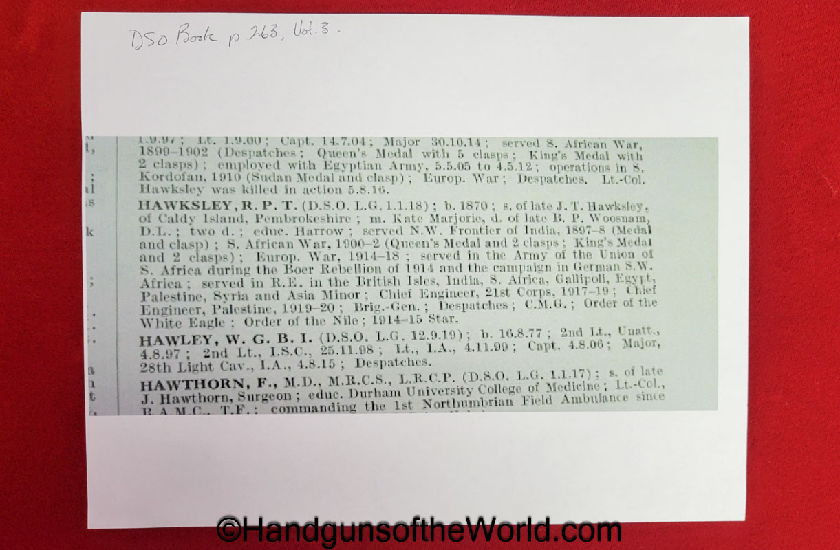 Randall Plunkett Taylor Hawksley began his distinguished military career in the Royal Engineers with the purchase of this very sword. He served with honor in the Boer War and played key roles in various imperial stations, including South Africa. His career culminated in his appointment as Chief Engineer (1917–1919) during the height of World War I, where he was instrumental in engineering logistics and infrastructure critical to the British war effort. He later rose to the rank of Brigadier General.