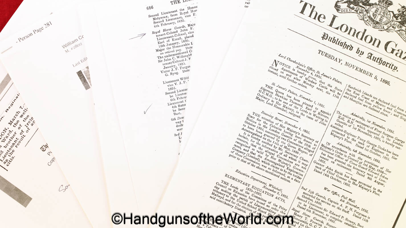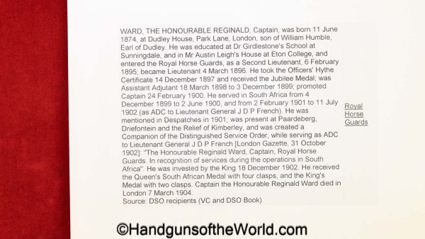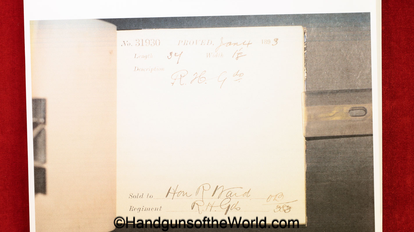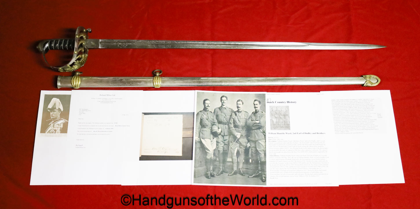 Wilkinson Royal Horse Guards Sword. Sold in 1893 to The Honorable Reginald Ward of the Royal Horse Guards. This includes the Milner research letter and a copy of the Wilkinson ledger sheet. Ward earned the Distinguished service order, and came from a family of Military men. Much Military history and some photos of the gent will be included with this package.